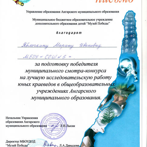 Победителями в номинации № 3 «Лучшая экскурсия на тему «Мой край – мой учебник» становятся Яблочкина Марина Ивановна, учитель географии, Чеканова Людмила Леонидовна, учитель информатики МБОУ «СОШ № 6», г. Ангарск, Иркутская область.